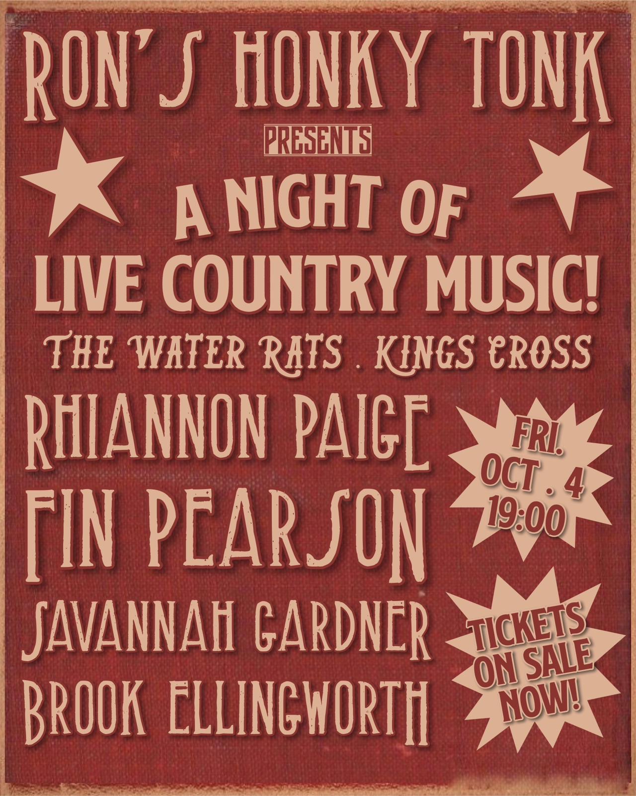 Dust off your boots and get ready for an epic evening filled with four sensational country music acts that’ll have you hootin’ and hollerin’ all night long! Back by popular demand, we’re thrilled to have the incomparable Rhiannon Paige gracing our stage once again along with Ron’s Honky Tonk favourite Fin Pearson also making his return. That’s not all – we’re thrilled to have the amazing Californian Cowgirl, Savannah Gardner, and the homegrown British talent, Brook Ellingworth, rounding out the lineup.
