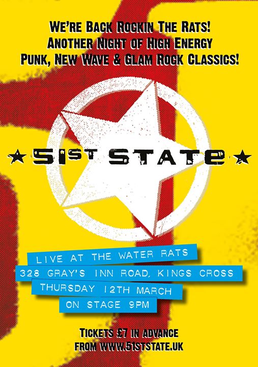 Details Date : 12 March Time : 19:00 - 23:30 Website : Facebook Event Tickets : Ticket Link 51st State Play Live at The Water Rats with special guest