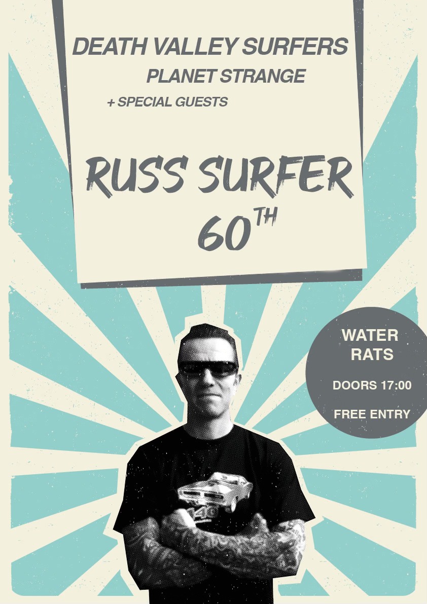 Details Date : 19 April Time : 17:00 - 23:00 Website : Facebook Event DEATH VALLEY SURFERS Planet Strange + Special guests RUSS SURFER 60th Free entrance Doors 17:00