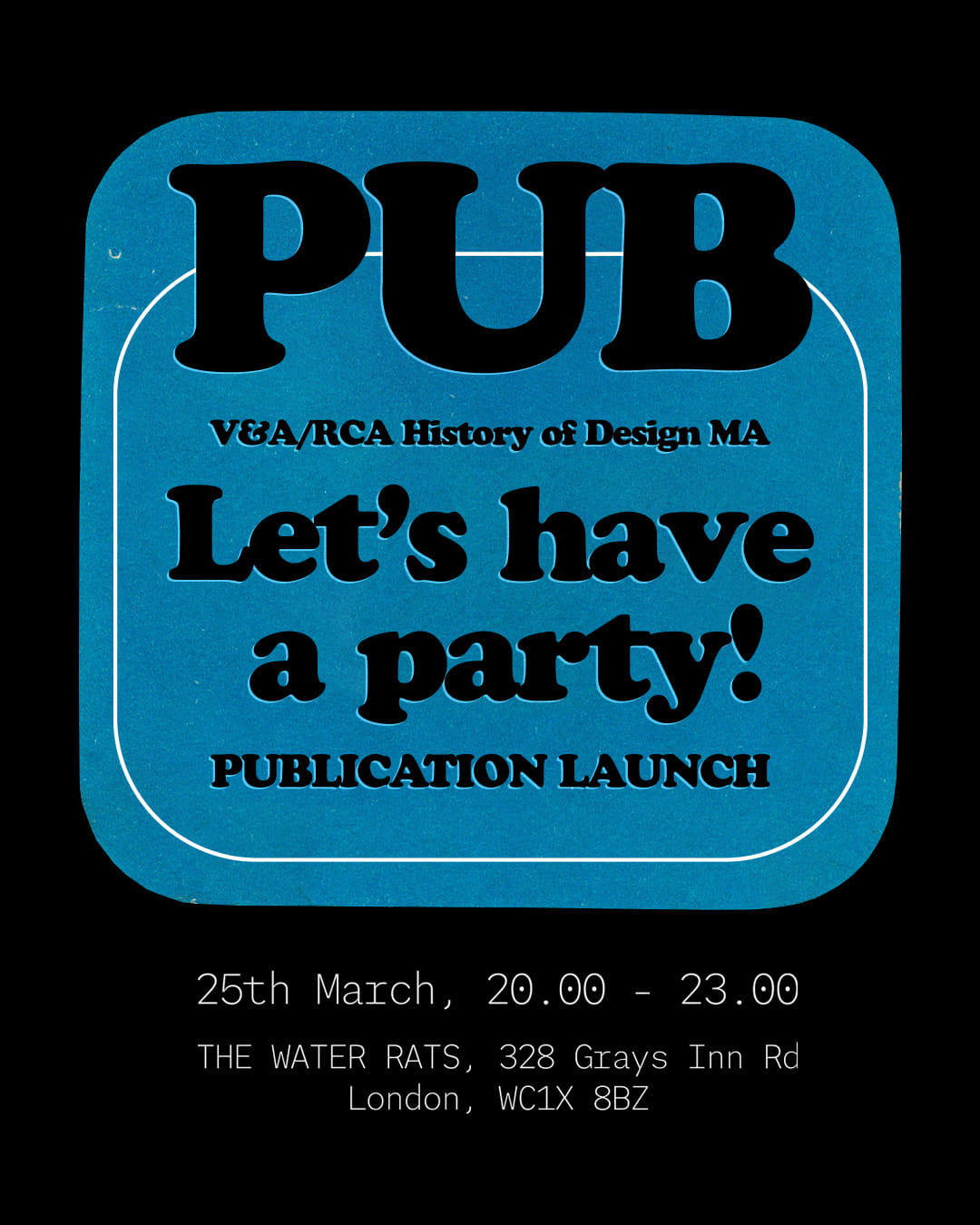 Join us for drinks and talks to celebrate the launch of PUB, a student publication curated, edited, written and designed by a group on the V&A/RCA History of Design MA. All welcome and admission is free!